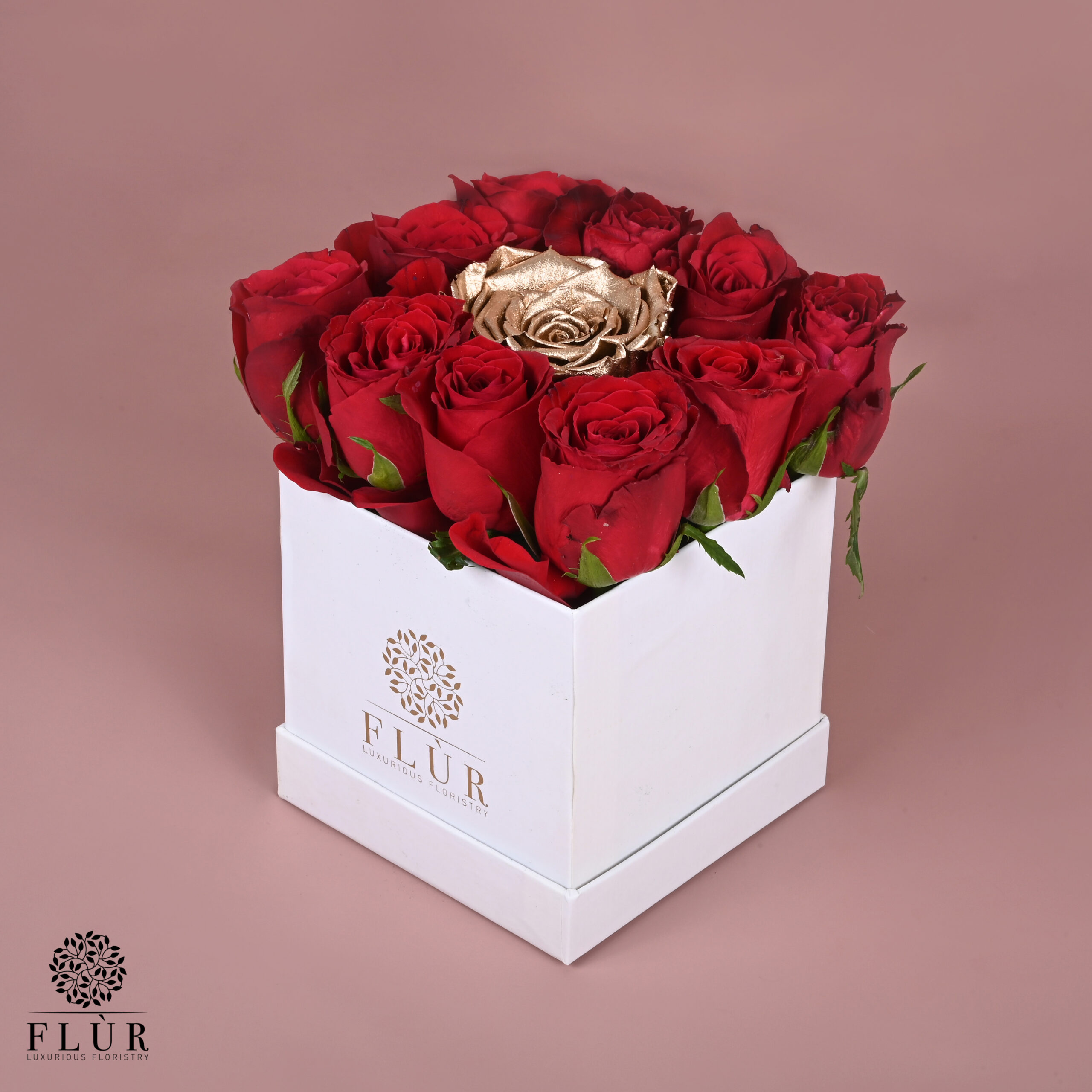 Discover elegance in simplicity with this compact box. In an extra-small size measuring L=12cm and H=12cm, it cradles a single gold eternal rose, harmoniously complemented by 10 vibrant red roses.