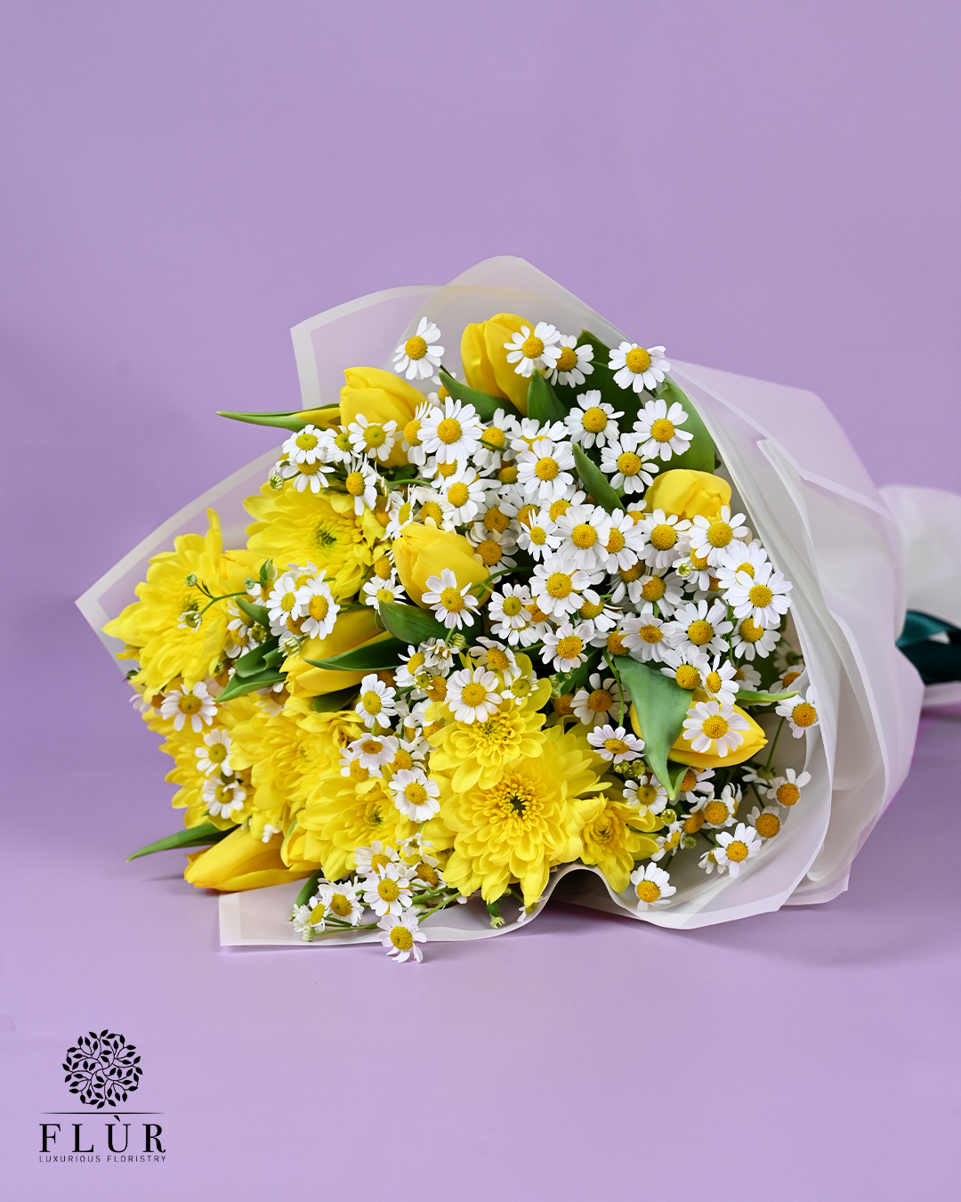The “Golden Bloom Bouquet” is a cheerful mix of yellow tulips and vibrant seasonal flowers, crafted to spread joy and light. A perfect choice to brighten moments, celebrate happiness, or simply make someone feel special.