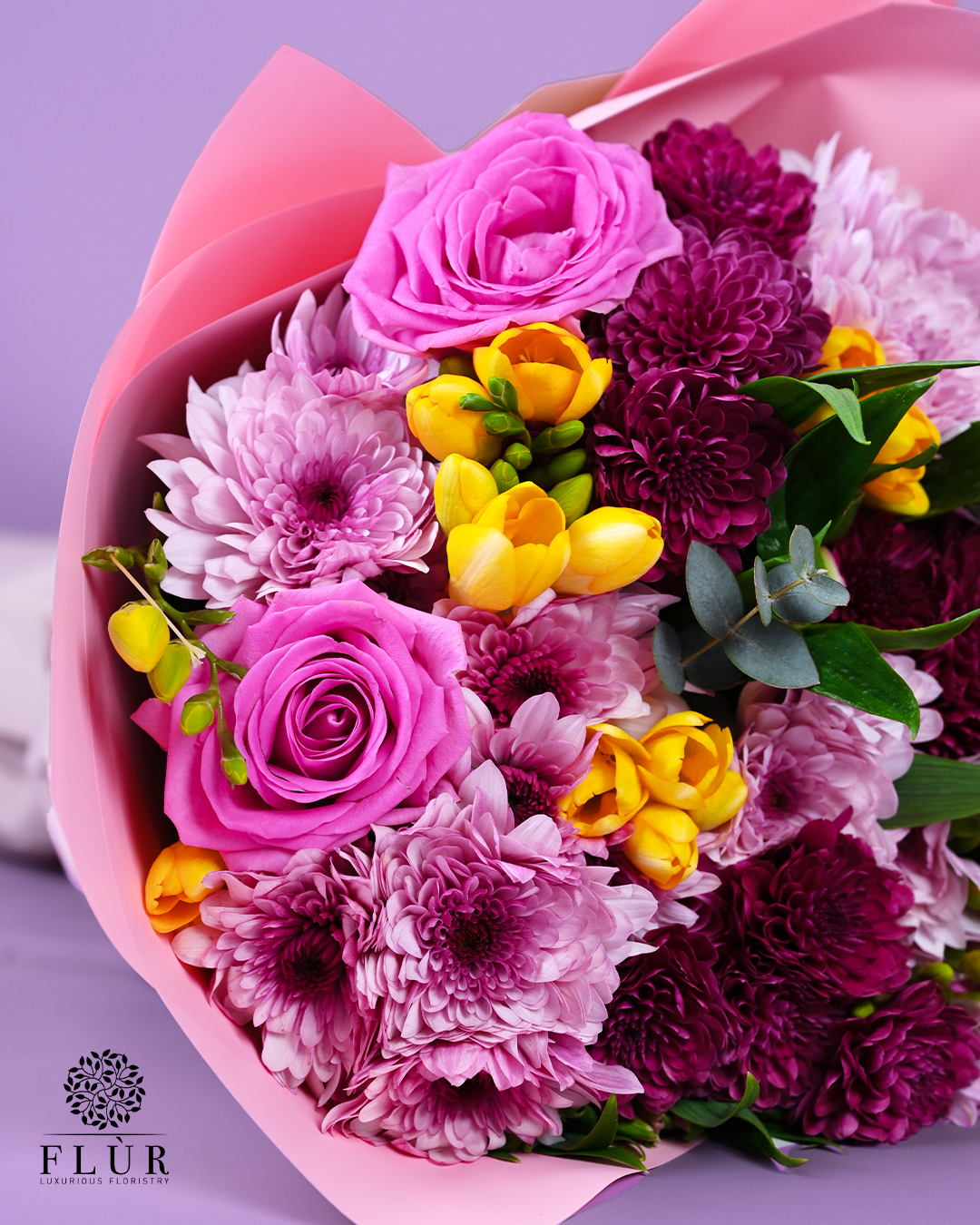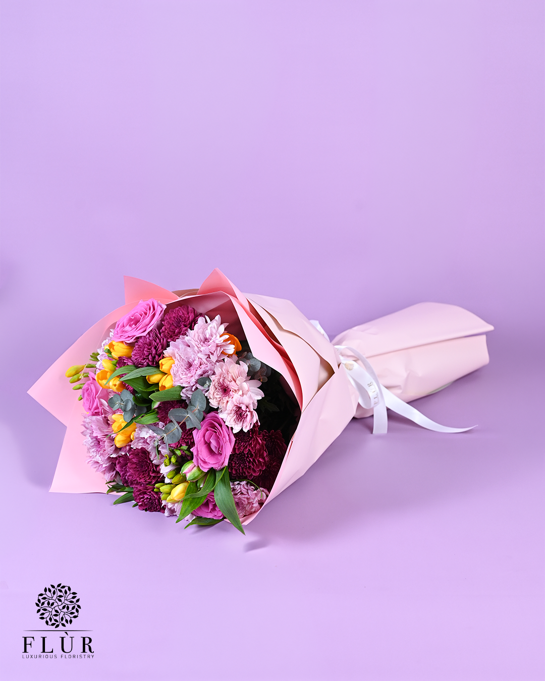 The “Royal Blush Mix” bouquet is a lively mix of roses and seasonal flowers in pink, purple, and yellow, creating a vibrant and joyful arrangement. Perfect for expressing love, appreciation, or simply bringing warmth and color to someone’s day.