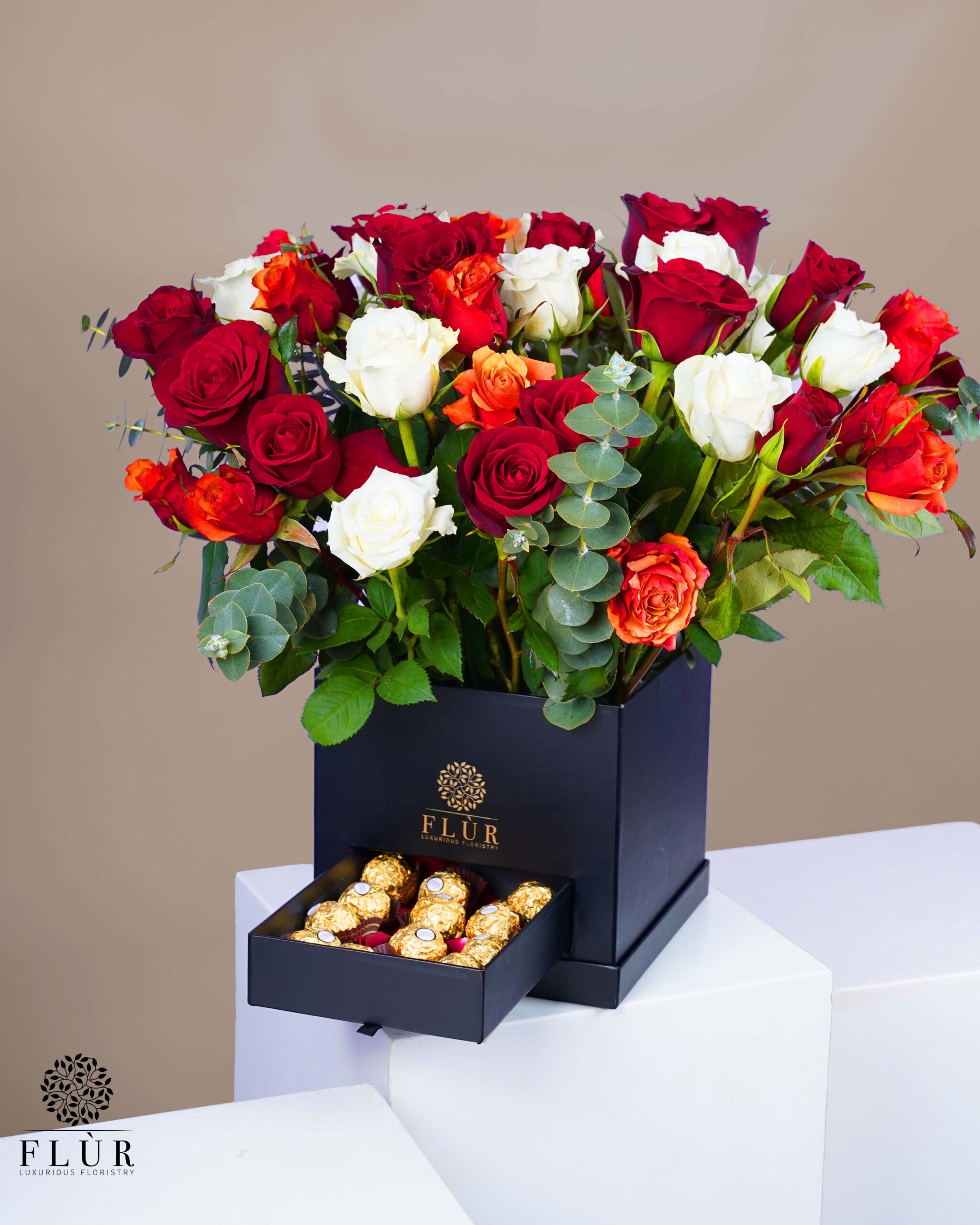 This square box contains 70 roses and 9 Ferrero Rocher chocolates.